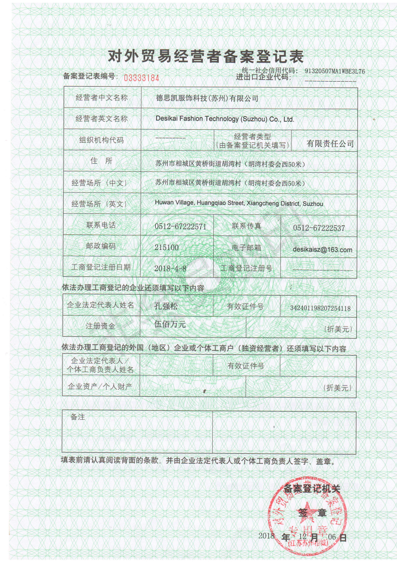 德思凱服飾科技(蘇州)有限公司系蘇州零點職業服裝廠(2006年注冊)原股東于2018年4月份注冊成立,主營業務是阿里巴巴國際站和績優外企的服裝服飾定制業務。本公司是一家集設計、生產、銷售于一體的生產型企業,專業從事各種工作服、職業裝、休閑服飾的設計與生產。公司匯集了從業數十年經驗的服裝設計師和優秀的管理人才,把“誠信立足天下,品質引領未來”作為企業的指導思想和行為準則,力爭為客戶體現獨有的企業文化。